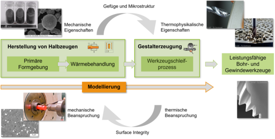 Um eine substantielle Verbesserung der Zerspanungswerkzeuge zu erzielen, ist es daher wesentlich, die gesamte Prozesskette und die Wechselwirkungen der Fertigungsschritte von der Substratherstellung, der Wärmebehandlung bis hin zur schleiftechnologischen Gestalterzeugung in die Optimierung einzubeziehen. Der Schleifprozess definiert zum einen die Gestalt, die Form- und Maßgenauigkeit des Werkzeuges und der Schneidelemente sowie die Oberflächenbeschaffenheit. Zum anderen werden bedingt durch das thermomechanische Lastkollektiv im Schleifprozess auch die Randzonenbeschaffenheit und die Mikrostruktur in Wechselwirkung mit der vorangegangenen Wärmebehandlung bestimmt. Der Schleifprozess ist dabei derart auszulegen, dass eine hohe Produktivität erzielt, gleichzeitig aber eine thermisch bedingte Schädigung vermieden wird. Für die Gesamtbetrachtung der Werkzeugherstellung muss daher ein grundlegendes Verständnis zur Entstehung und Veränderung der Randzonenbeschaffenheit in Abhängigkeit von den Formgebungsprozessen, der Wärmebehandlung und der schleiftechnologischen Endbearbeitung aufgebaut werden. Dabei ist zur effizienten Auslegung der Werkzeugherstellung ein Werkstückmodell zu initiieren, das die Veränderungen über die gesamte Prozesskette abbilden kann. Durch die Verknüpfung von Erkenntnissen aus den Schleifprozessen und entsprechenden Modellen zur thermomechanischen Belastung mit der Modellierung der Wärmebehandlungsprozesse ist es das Ziel, die Werkstoffeigenschaften unter Berücksichtigung der gesamten Herstellungskette einzustellen, Schädigungen und kritische Werkstoffveränderungen der Zerspanungswerkzeuge in der Herstellungsroute zu vermeiden, und so die Leistungsfähigkeit der Zerspanungswerkzeuge zu erhöhen. Als Demonstratoren für das geplante Forschungsvorhaben wurden zu diesem Zweck Bohr- und Gewindebohrwerkzeuge aus PM-HSS ausgewählt.