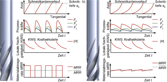 Dynamische Effekte wie Werkzeug- und Werkstückschwingungen begrenzen die Qualität und Produktivität spanender Prozesse. Ein zentraler Mechanismus ist der Regenerativeffekt, bei dem durch periodische Veränderungen der Spanungsdicke und unterbrochene Schnittkräfte selbsterregte Schwingungen entstehen. Klassische Maßnahmen wie die Anpassung des Helixwinkels oder eine Prozessauslegung mit nur einem Zahn im Eingriff reduzieren zwar die Gesamtprozesskraft, berücksichtigen jedoch nicht die lokal variierende Nachgiebigkeit von Fräswerkzeugen. Diese können als einseitig eingespannte, deformierbare Körper betrachtet werden, deren Nachgiebigkeit entlang der Achse zunimmt, insbesondere zur Werkzeugspitze. Dadurch entstehen weiterhin unerwünschte dynamische Anregungen.